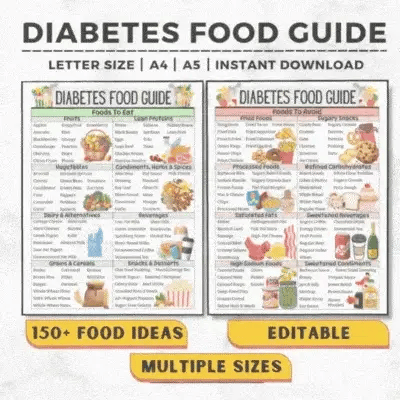 This bundle provides clear guidance on important aspects like ideal blood sugar levels, tracking meals, and managing your health. Designed to help you stay informed and organized.